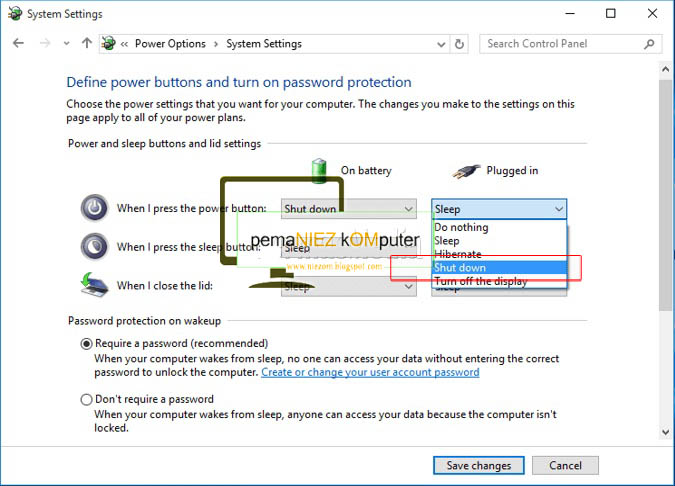 - Masih pada kotak dialog “System Settings”, rubah nilai “When I press the power button ke Shut down” baik untuk “On battery” maupun “Plugged in” dengan memilih dari daftar drop-down